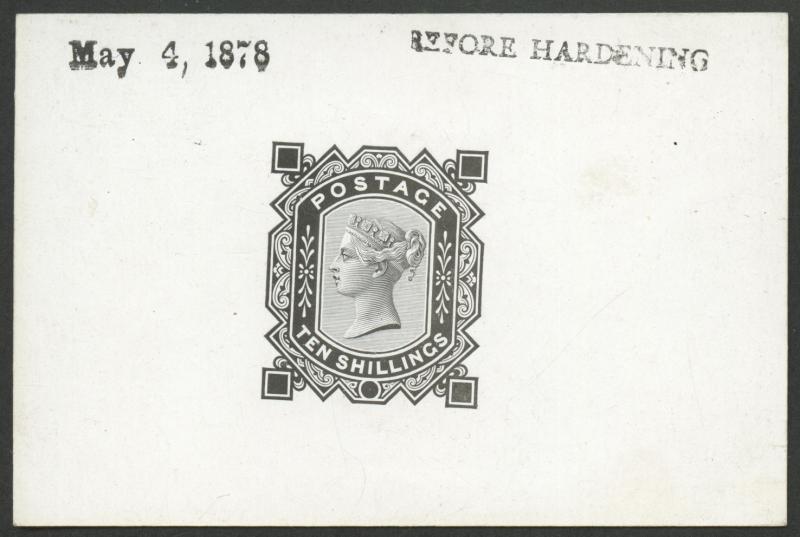 1867-83 High Values Maltese Cross Watermark 10/- progressive die proof (no corner letters or plate number) in black on highly-surfaced card handstamped 'May 4 1878' at upper-left & 'BEFORE HARDENING' at upper-right, some very minor surface-rubbing, SG Specialised Cat £3500. Gorgeous. (Image1)