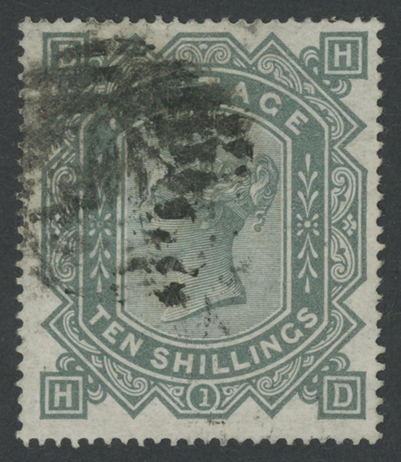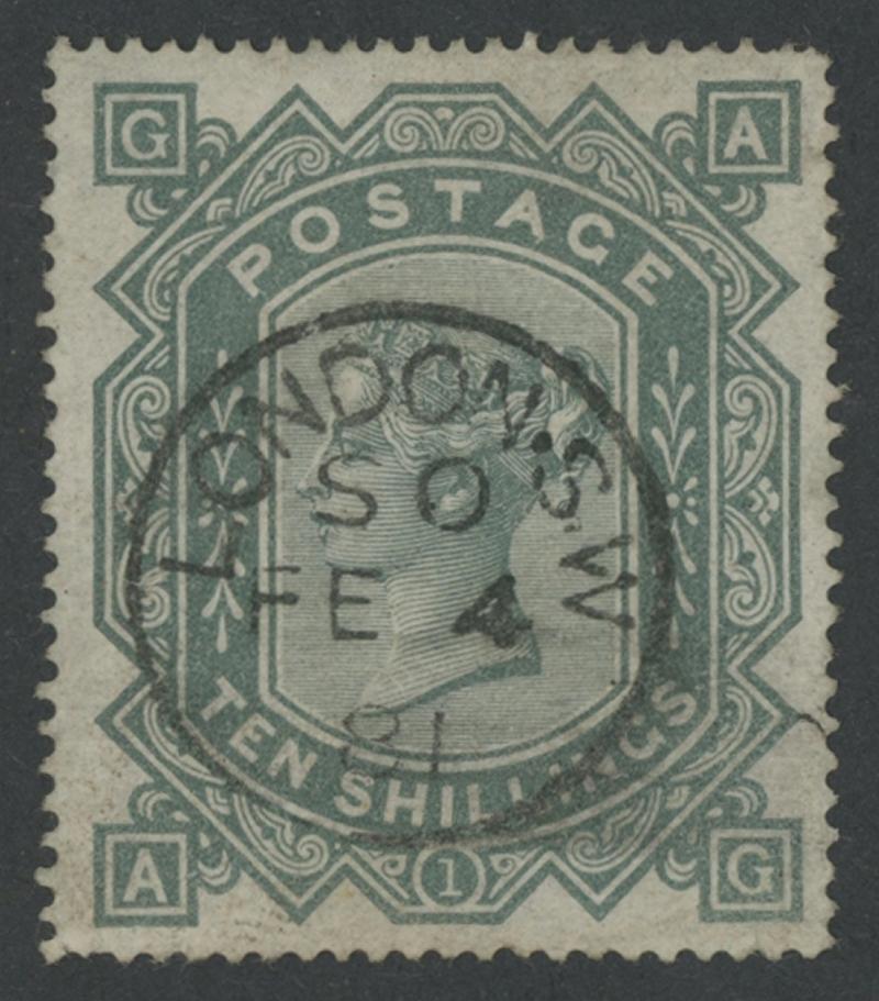 1867-83 High Values Maltese Cross Watermark 10/- greenish grey SG 128, unusually well centred, a couple of shortish perfs, superb centrally struck 'LONDON/ SO /FE4/81' cds, Cat £3200. (Image1)