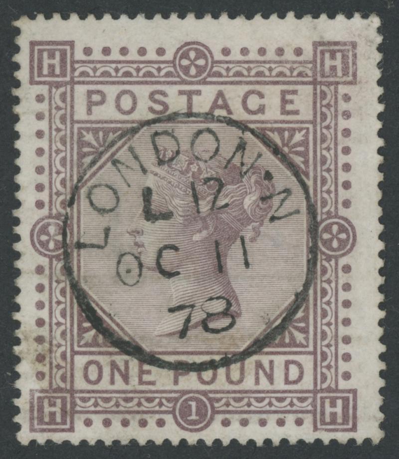 1867-83 High Values Maltese Cross Watermark £1 brown-lilac SG 129, characteristic centring, faint crease at upper-right corner otherwise superb with a superb socked-on-the-nose 'LONDON/ L12 /OC11/78' cds, Cat £4000. (Image1)