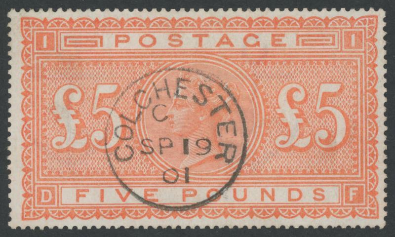 1867-83 High Values Anchor Watermark White Paper £5 orange SG 137, well centred, superb 'COLCHESTER/ C /SP19/01' cds, Cat £3600. Superb. [Our very discerning vendor paid $4500 at Spring Stampex in London in 2018] (Image1)