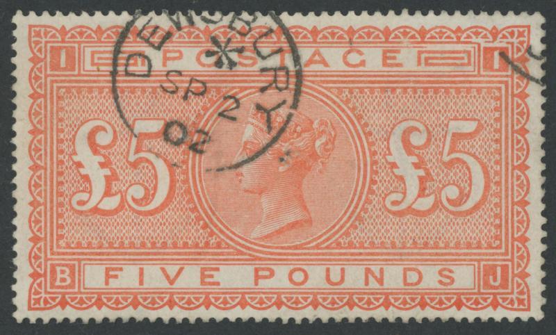 1867-83 High Values Anchor Watermark White Paper £5 orange SG 137, exceptional centring, very fine large-part 'DEWSBURY/ * /SP2/02' cds, two small guarantee handstamps on the reverse, Cat £3600. (Image1)