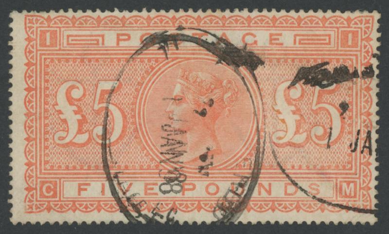 1867-83 High Values Anchor Watermark on White Paper £5 orange SG 137 [Letters C-M], two indistinct oval cancels, a few uneven perfs, Cat £3600. (Image1)