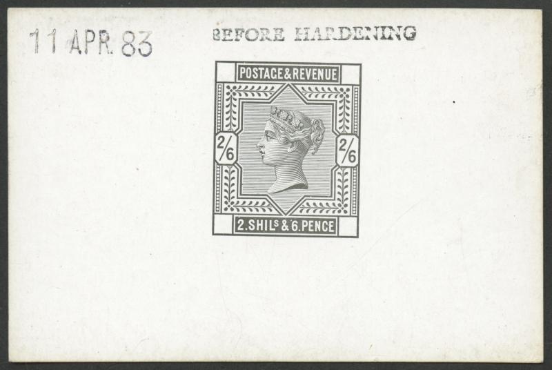 1883-84 High Values 2/6d progressive die proof (no corner letters) in black on highly-surfaced card handstamped '11APR83' at upper-left & 'BEFORE HARDENING' at upper-right, SG Specialised Cat £2800. Superb. (Image1)