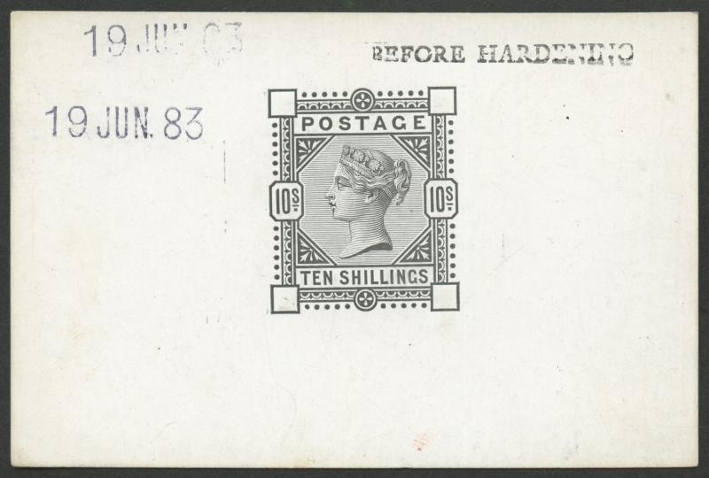 1883-84 High Values 10/- progressive die proof (no corner letters) in black on highly-surfaced card handstamped '19JUN83' (twice) at upper-left & 'BEFORE HARDENING' at upper-right, SG Specialised Cat £3750. Gorgeous. (Image1)