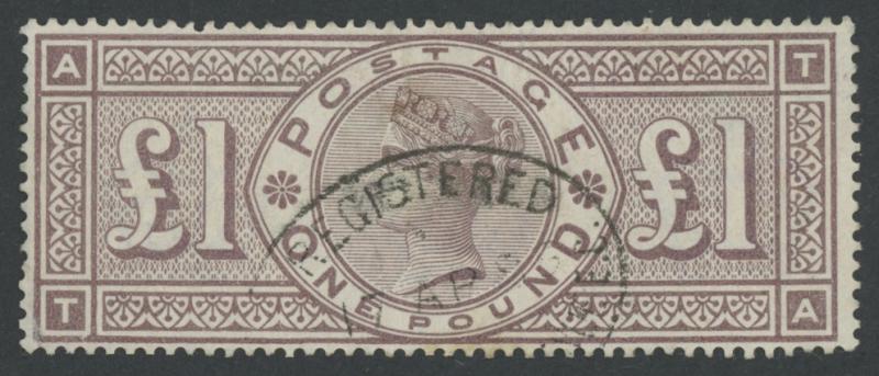 1884 High Values Imperial Crowns Watermark £1 brown-lilac SG 185 [T-A], neat registered oval cancel, small pin-hole/thin, one short perf, Cat £3000. (Image1)
