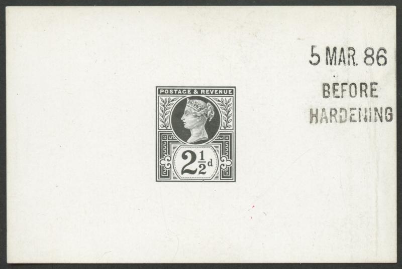 1887-92 Golden Jubilee 2½d die proof in black on highly-surfaced card handstamped '5MAR86' & 'BEFORE/HARDENING' both at upper-right, light vertical crease at right but the stamp impression is superb, SG Specialised Cat £1550. (Image1)