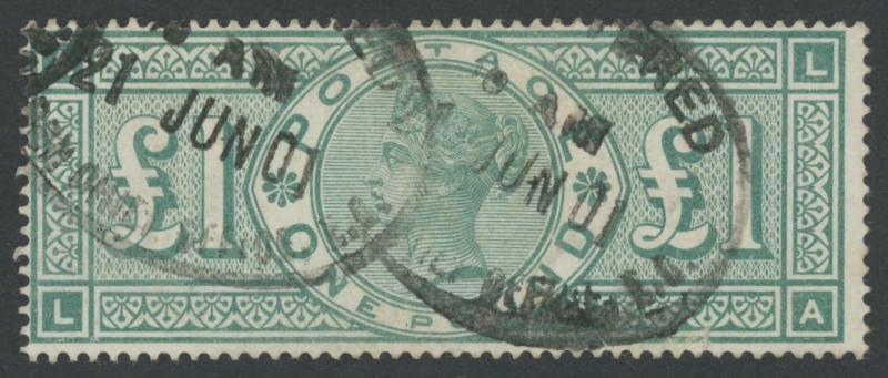 1897 QV Jubilee £1 green SG 212 [L-A], two 1901 registered oval cancels, Cat £800. (Image1)