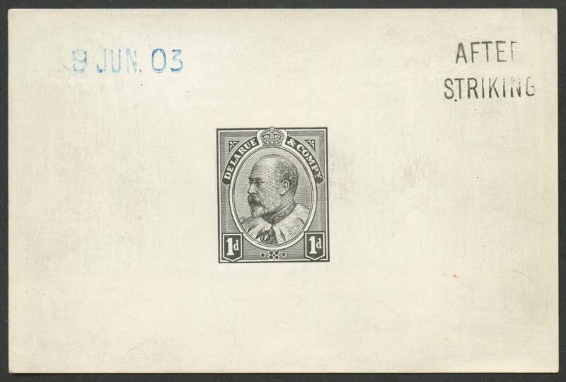 1902-10 KEVII Definitives De La Rue Printings 1d essay - the so-called 'Canada Head' Die I - die proof in black on highly-surfaced card handstamped '9JUN03' in blue at upper-left & 'AFTER/HARDENING' at upper-right, surface-rubbing clear of the stamp impression, SG Specialised Cat £5500. (Image1)
