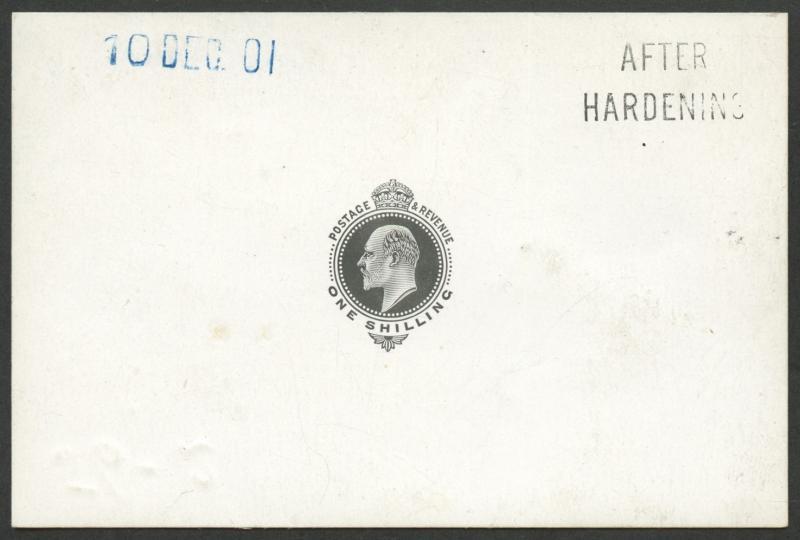 1902-10 KEVII Definitives De La Rue Printings 1/- progressive die proof of the vignette only in black on highly-surfaced card handstamped '10DEC01' in blue at upper-left & 'AFTER/HARDENING' at upper-right, surface-rubbing & faint blemishes, SG Specialised Cat £3600. (Image1)