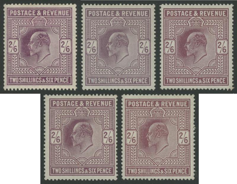 1902-10 KEVII Definitives De La Rue Printings high values group comprising 2/6d lilac to purple SG 260-263 shades x5, one stated to be Somerset House printing; and 5/- bright carmine & 5/- deep bright carmine SG 263-4, mostly well-centered, Cat £2500+.