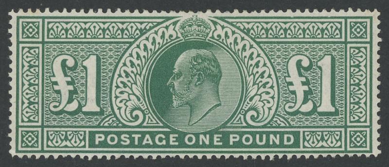 1902-10 KEVII Definitives De La Rue Printings £1 dull blue-green SG 266, a couple of uneven perfs at base, paper a little aged, adhesion and hinge remainder, Cat £2000. (Image1)