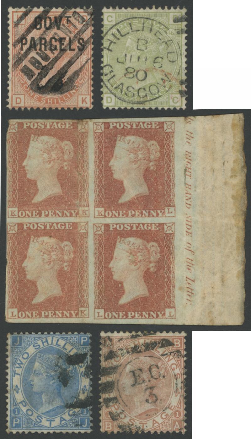 Small collection on old-time leaves including 1840 Penny Black lightly cancelled (3 margins) and 1841 Penny Red block of 4 */** with '... the RIGHT HAND SIDE of the Letter ...' marginal imprint (the left-hand units cut-into at left, the right-hand units with large margins; some creasing; Cat £3000+), other Line-Engraved & Embossed issues including a Penny Stars Plate Number study, then Surface-Printed range to 10/- including 4d sage-green single & pair, 2/- blue and an apparently very fine 2/- brown (Cat £4250) plus 1/- brown 'GOVT/PARCELS' overprint, KEVII to 10/-, and a smattering of later issues to KGVI, a few commercial perfins, some aging marks, hinge thins or other mostly minor faults but many are fine to very fine.