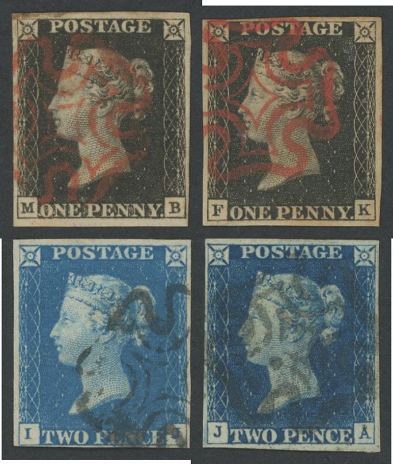 1840-57 QV Line Engraved group comprising 1840 1d black x3 with Maltese Cross cancels in red, 2d pale blue, and 2d deep full blue both with Maltese Cross cancels in black, 1841 White Lines 2d blue, and 1854 Stars 1d red x2, all with full margins, fine to very fine, Cat £2300+. (8) (Image1)