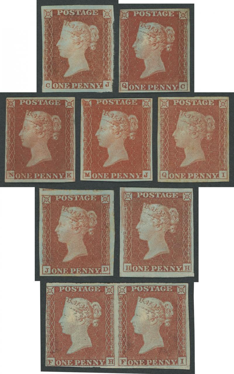 1841 QV Line Engraved Penny Red 1d red group between SG 8-12 comprising seven singles and a horizontal pair in a range of shades one with a decidedly 'orange' tinge, stated to be from Plates 23 [CJ], 53 [QC] with small-part Corner Guideline, 60 [NK] with Ivory Head, 64 [MJ] with Distorted Star at Upper-Left, 101 [QI], 110 [JD], 124 [HH] with Distorted Frame at Upper-Left, and 149 Alphabet II pair [FH-FI] both units with Ivory Head, each with margins just clear to large except the pair just touched at upper-left, most with virtually full or large-part gum, those from Plates 60, 110 & 124 without gum, Cat £5400+ for unused basic shade singles. [With the annotated album page on which they were mounted] (7 + pair) (Image1)