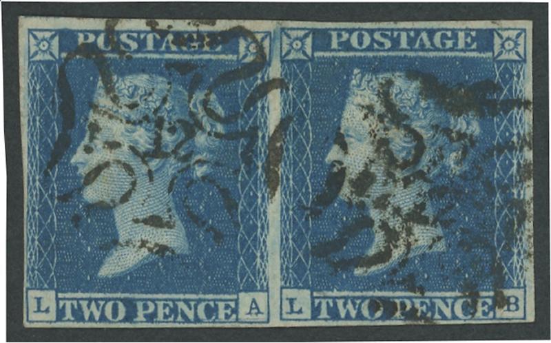 1841 QV Line Engraved Tuppence Blue White Lines 2d blue SG 14 horizontal pair [LA/LB], margins just clear to large, largely very fine central upright strike of Maltese Cross '12' Numeral cancel in black on the left-hand unit with a lesser strike alongside, Cat £1100+ for singles. (Image1)