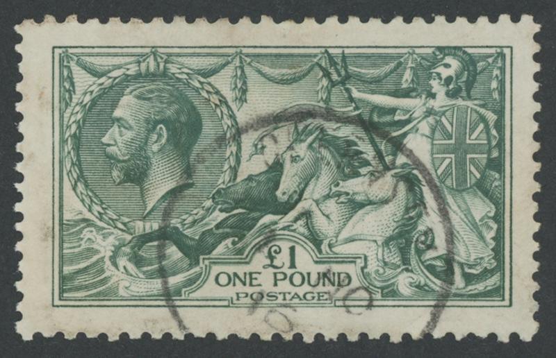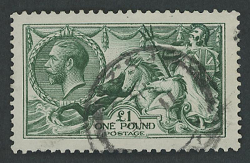 1913-19 Seahorses Waterlow Printings £1 green SG 403, exceptional centring, indistinct London steel cds, Cat £1400. A superb example of this beautiful stamp. (Image1)