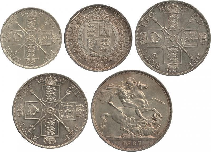 1887 QV Jubilee Head group comprising Maundy 3d Spink 3934, 6d S3929, Florin 2/- S3925, Half-Crown 2/6d S3924, Double-Florin 4/- Roman '1' in Date S3922, Arabic '1' in Date S3923, and Crown 5/- S3921, all Uncirculated.