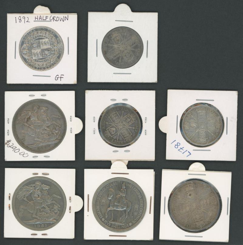 QV-QEII group comprising QV Jubilee Head Florin 2/- 1887, 1888 (2) Spink 3925, Half-Crown 2/6d 1892 S3924 (cleaned), Double-Florin 4/- Arabic '1' in Date S3923, Crown 5/- 1887 S3921; plus Crowns KGVI 1951, & QEII 1952, condition variable. (8) (Image1)