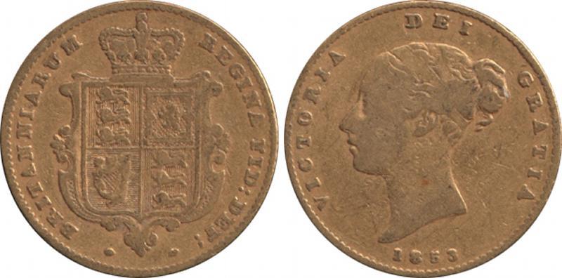 HALF-SOVEREIGN: 1853 QV Young Head Shield reverse, Marsh 427, Spink 3859, aFine, (Image1)