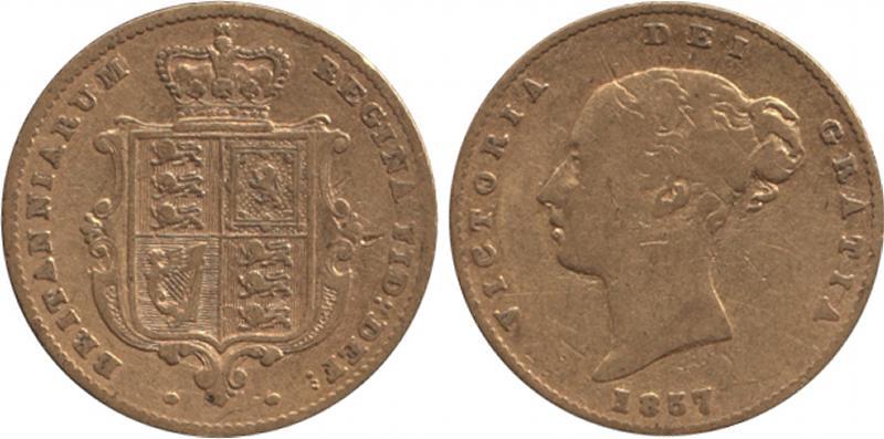 HALF-SOVEREIGN: 1857 QV Young Head Shield reverse, Marsh 431 (rated Scarce), Spink 3859, aFine. (Image1)
