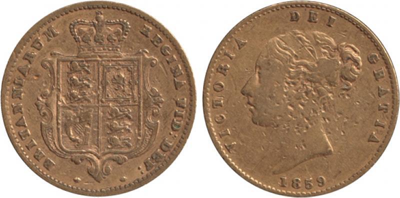 HALF-SOVEREIGN: 1859 QV Young Head Shield reverse, Marsh 433, Spink 3859A, obverse pitting, aFine. (Image1)