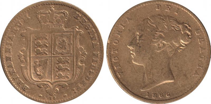 HALF-SOVEREIGN: 1866 QV Young Head Shield reverse, Marsh 30, Spink 3852, gFine. (Image1)