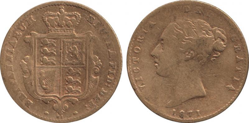 HALF-SOVEREIGN: 1871 QV Young Head Shield reverse, Die '20' (not listed in Numbers So far Known Marsh), Marsh 442, Spink 3860D, light bend, Fine. (Image1)