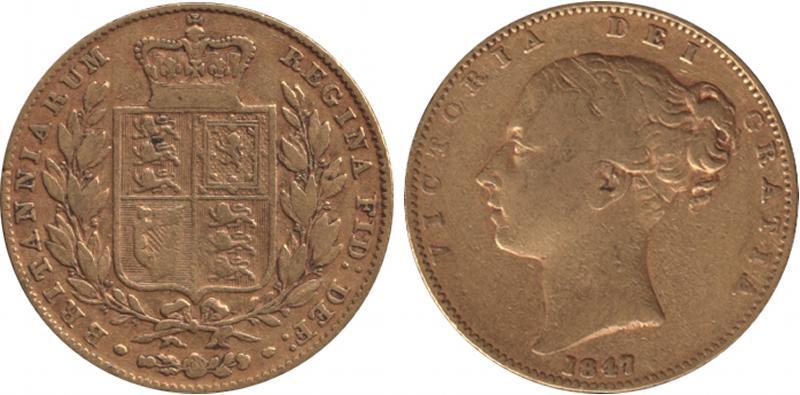 SOVEREIGN: 1847 QV Young Head Shield reverse, Marsh 30, Spink 3852, gFine. (Image1)