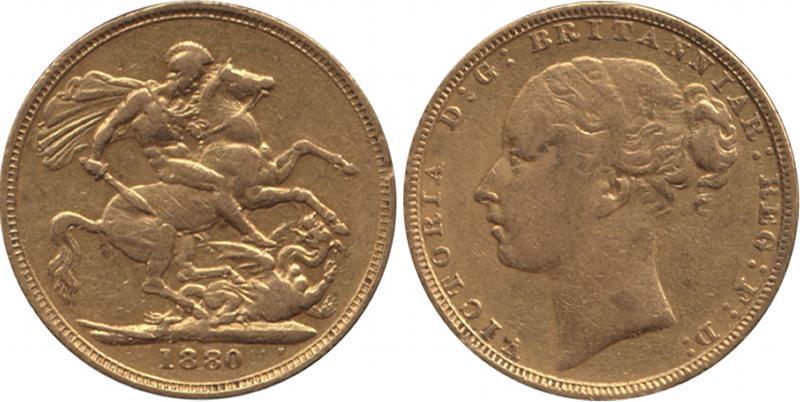 SOVEREIGN: 1880 QV Young Head St George reverse Long Tail, Marsh 91D, Spink 3856A, Fine. (Image1)