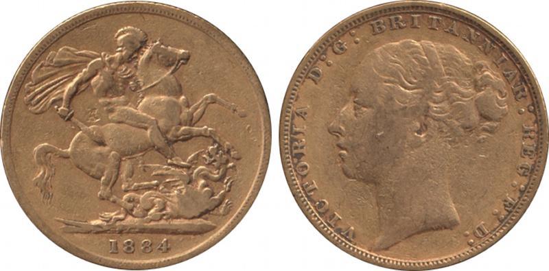 SOVEREIGN: 1884 QV Young Head St George reverse 'WW' Buried Short Tail, Marsh 92, Spink 3856B, Fine. (Image1)