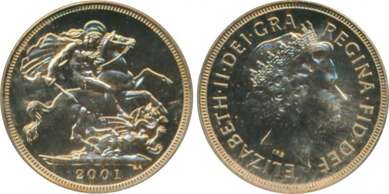 SOVEREIGN: 2001 QEII Fourth Bust St George reverse, Marsh 315, Spink SC4, in PCGS holder graded 'MS67/One of the first thousand struck'. (Image1)