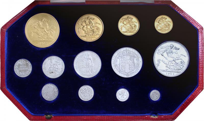 SPECIMEN SET: 1902 KEVII Matte Finish set of thirteen comprising Maundy 1d 2d 3d & 4d; silver 6d 1/- (small carbon spot) 2/- 2/6d and Crown; gold Half-Sovereign, Sovereign, Double-Sovereign, and £5; in original red case embossed 'SPECIMEN COINS/[Crown]/1902'. (13) (Image1)