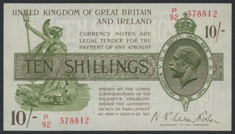 1922 10/- Fisher, Duggleby T30 red serial 'P/92 378812', Dennis, Faulkner & Alsop solicitors four line address stamp on reverse otherwise Uncirculated. (Image1)