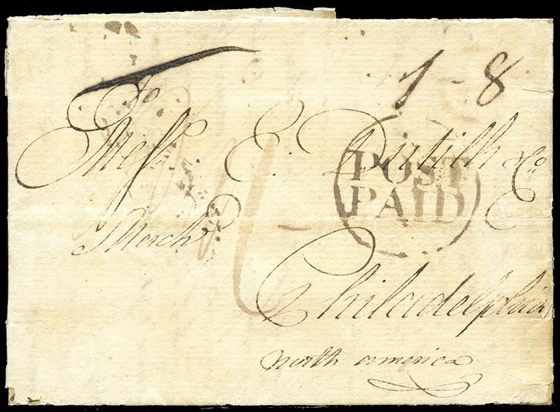 1825 folded TRANSATLANTIC letter from LONDON 22 JAN to Quebec with manuscript via New York, straight line SHIP and NEW-YORK 7 MAR transit all in red, rated (US POSTAGE collect) 20¾ (2d ship letter fee and 18¾ postage to the border) and 2/1 currency due on arrival, very fine. (Image)