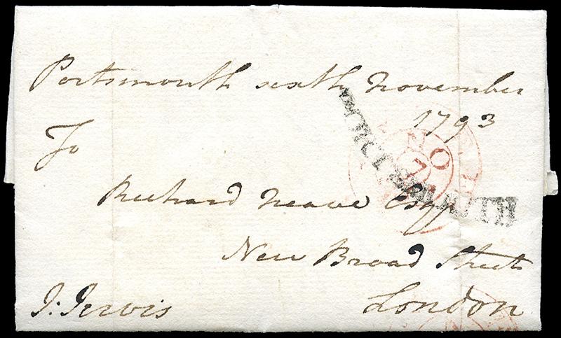 1793 folded letter, red FREE 7 NO 93 Treble circle to London, ms 'Portsmouth sixth November' from J. Jervis (Vice-Admiral Sir John Jervis), transcribed letter attached. (Image)