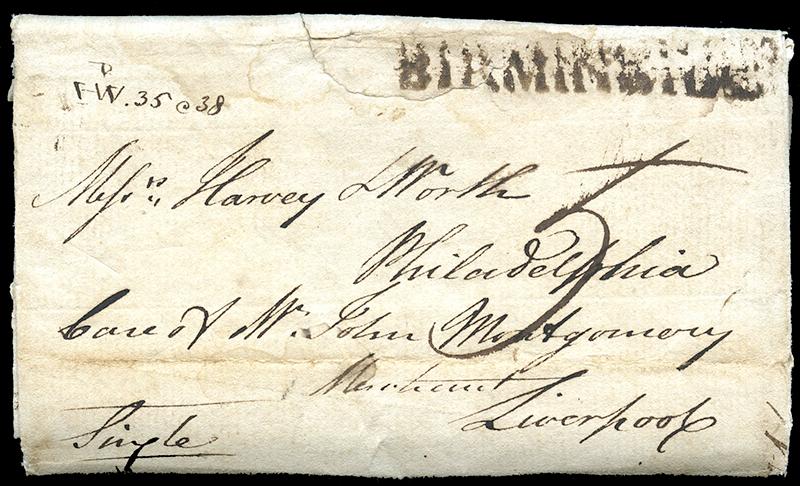1796 Large folded Bill of Lading, internally dated Birmingham 10 September 1796, rated ms 5/, BIRMINGHAM straight line hand stamp, to Liverpool, re 9 bundles of spades, 4 bundles of shovels, cast of hardware, and cask of clothing, jewelry, etc. (Image)