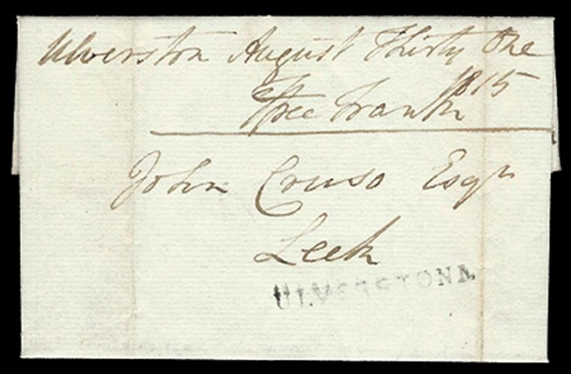 1815 Folded letter dated 31 August 1815 (manuscript despatch date) to Leek, with very fine strike of ULVERSTONE straight line at bottom, endorsed 'Free Frank' at top and delivered without postal charges, the letter is from and is signed by (Admiral) Frank Frank, filing folds, otherwise fine. (Image)