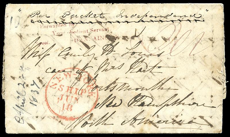 1837 folded letter with handstamp 'Forwarded by Your obedient Servant. L'pool. DAN. AINSLEE, (R3), red NEW YORK SHIP 18 JUN, to Portsmouth NH, rated 20-¾¢ (18-¾¢ plus 2¢ for delivery beyond Port, manuscript "Per Packet Independence", separating at folds.(Image)