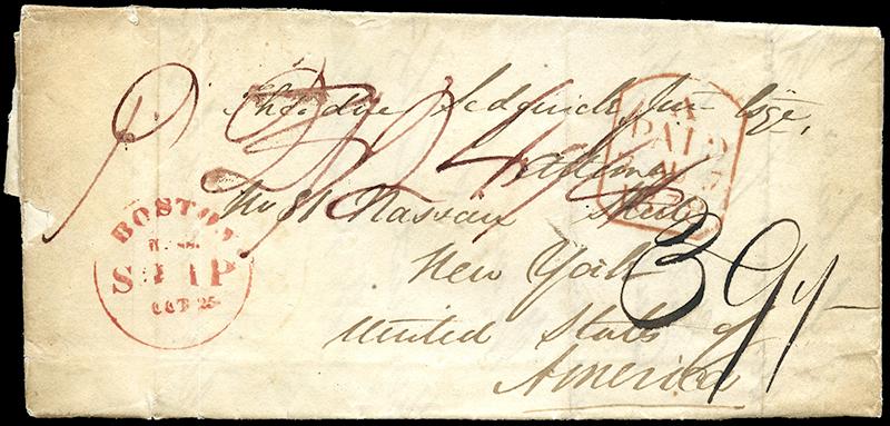 1838 Folded transatlantic letter, BRIGHTON 6 AU 1838 on reverse, rated ms 2/2 and changed to 4/4 prepaid, just missing Falmouth packet and sent by US sailing packet to Boston, red BOSTON SHIP OCT 25 hand stamp, ms rated 39½¢ collect to New York, AMERICA, filing folds. (Image)