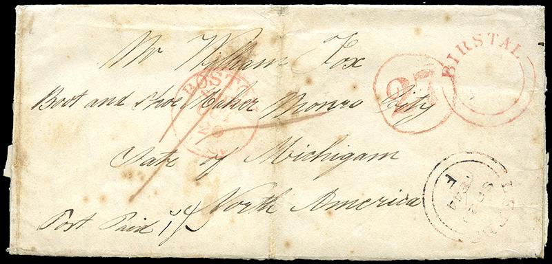 1844 Folded transatlantic letter, red BRISTAL undated, via LEEDS 20 SEP 1844 F, red BOSTON SHIP OCT 20 to Monroe Michigan, rated ms 1/, with SCARCE red '27' in circle handstamp, oval L SE 21 A on reverse, toned and filing folds. (Image)