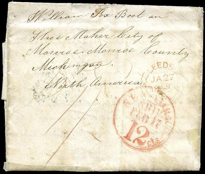 1848 Folded transatlantic letter, headlined Bristal 17 Jany, red LEEDS 27 JA 1848 E, LIVERPOOL 28 JA 1848 A on back, red NEW YORK SHIP 17 FEB 12cts handstamp, to Monroe Michigan, rated ms 1/ and 5d in red PAID, oval ? JA 28 M, on reverse, toned, and small faults. (Image)