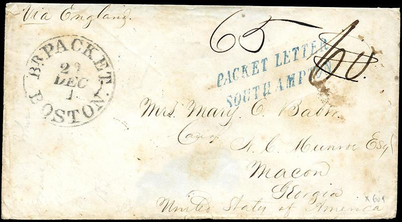 1851 transatlantic cover, green 2-line PACKET LETTER SOUTHAMPTON, and SOUTHAMPTON 11 DE 1851 C (on back), ms ‘Via England’, rated 60 and crossed out re-rated 65 carried by Cunarder Canada, to Macon Georgia Untied States of America, BR. PACKET 29 DEC 1 BOSTON handstamp, toning and part of back missing. (Image)