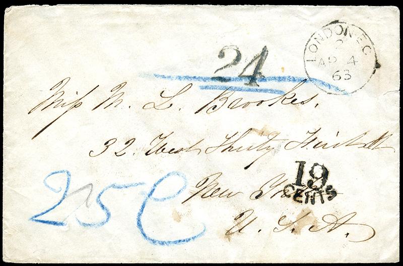 1863 transatlantic monogrammed cover, small LONDON E C 4 AP 63, rated 19 CENTS (collect) and 24 hand stamps, 24 crossed out and 25C written in crayon, to New York USA, part of back flap missing. (Image)