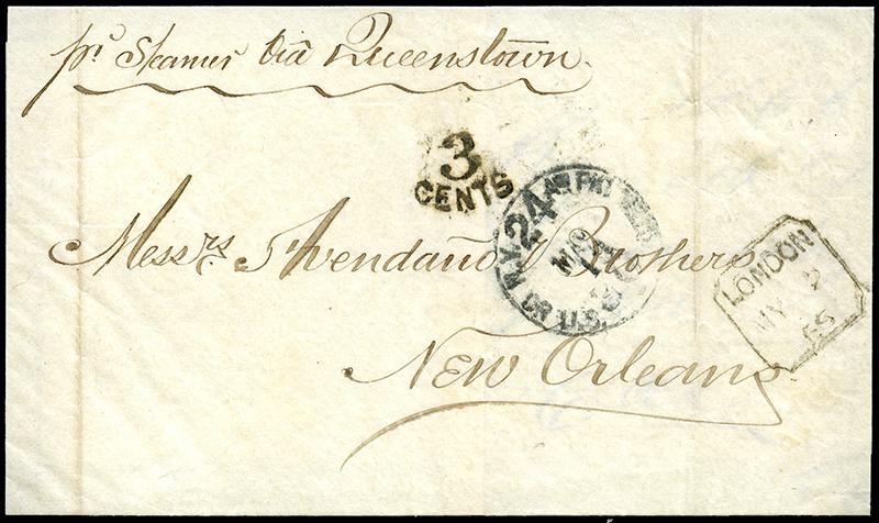 1866 transatlantic folded cover, LONDON 2 MY 66 hand stamp, ms 'per Steamer via Queenstown', rated 3 CENTS (collect) to New Orleans USA, scarce N.Y. 24 Am PKT OR U.S. 30 NOTES 19 MAY oval, and ALEXANDER BELL & SONS LONDON forwarding agent hand stamp on reverse, filing folds. (Image)