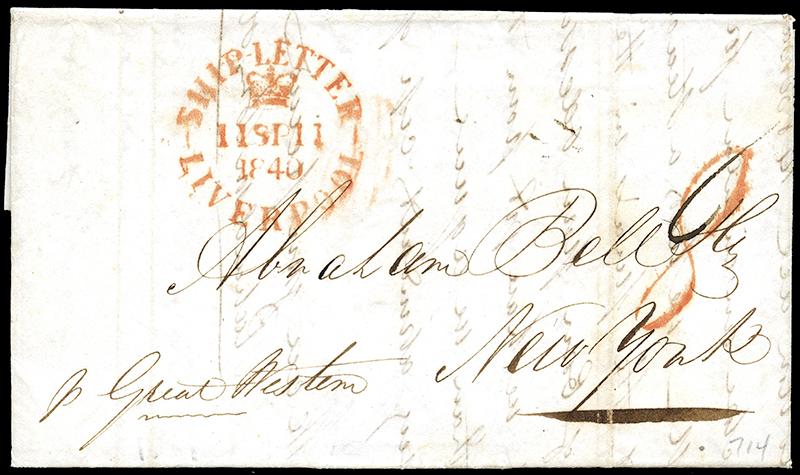 1840 folded transatlantic letter, red CROWN SHIP-LETTER 11 SP 11 1840 LIVERPOOL (S.15), manuscript 'p Great Western' to New York (USA), rated red hand stamp 8(d), ms 6(¢) collect, six times rate, very fine. RARE.(Image)