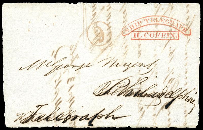 SHIP TELEGRAPH, H. COFFIN (Atlantic Ocean) handstamp in red, front only, re 6(¢) in circle, Liverpool to Philadelphia, ms "pr Telegraph" (Image)