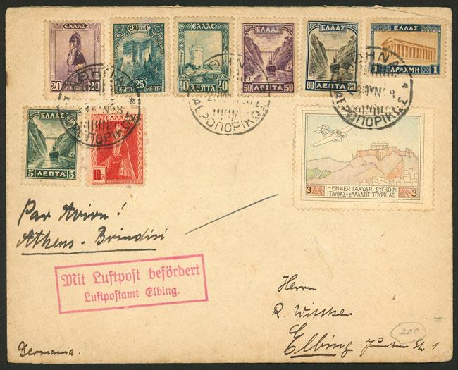 28/JUN/1928 First flight Athens - Brindisi, very nice multicolor franking, arrival backstamp, VF! (Image)
