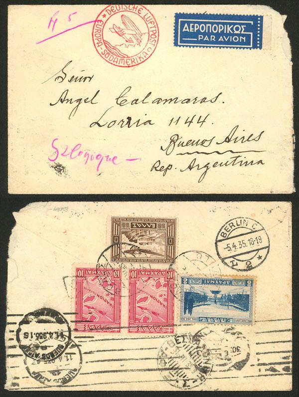 Airmail cover sent to Argentina on 30/MAR/1935 with good franking of 78d. including Sc.C21 (1933 50d., high value of the set), sent via Germany DLH, arrival mark of Buenos Aires 11/AP, small opening defect in one corner, very attractive! (Image)