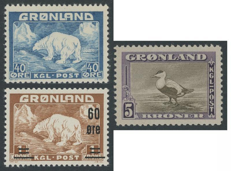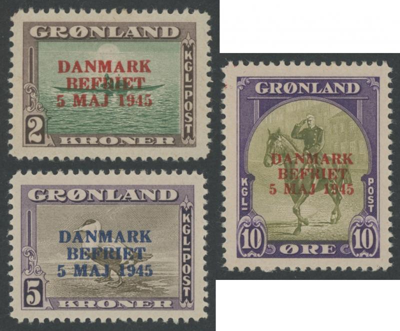 1945 Liberation of Denmark Overprints on Pictorials 1o to 5k set SG 17-25 (Michel 17-25) the 10o with Overprint in Red SG 20a (Michel 20 I), generally well-centred, lightly mounted, Cat £1800+ (€1350) for unmounted.
