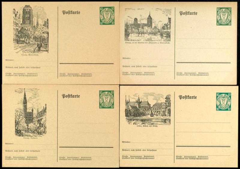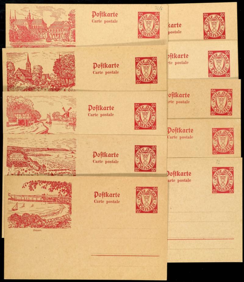 1920 - 1939, recht umfangreiche und stark spezialisierte Sammlung in vier Alben, alles chronologisch sortiert und kenntnisreich ausgezeichnet, insgesamt über 350 Stück mit vielen besseren, beginnend ab einigen Vorläuferkarten, dabei auch Halbamtliche Postkarten mit gelaufenen und ungelaufenen Stücken, im Anhang Port Gdansk mit vielen seltenen Stücken, die Erhaltung schwankt etwas ist insgesamt aber als gut zu bezeichnen, der Katalogwert liegt überschlagen bei über 23.000.- Euro - in dieser Konzentration heutzutage kaum angeboten!